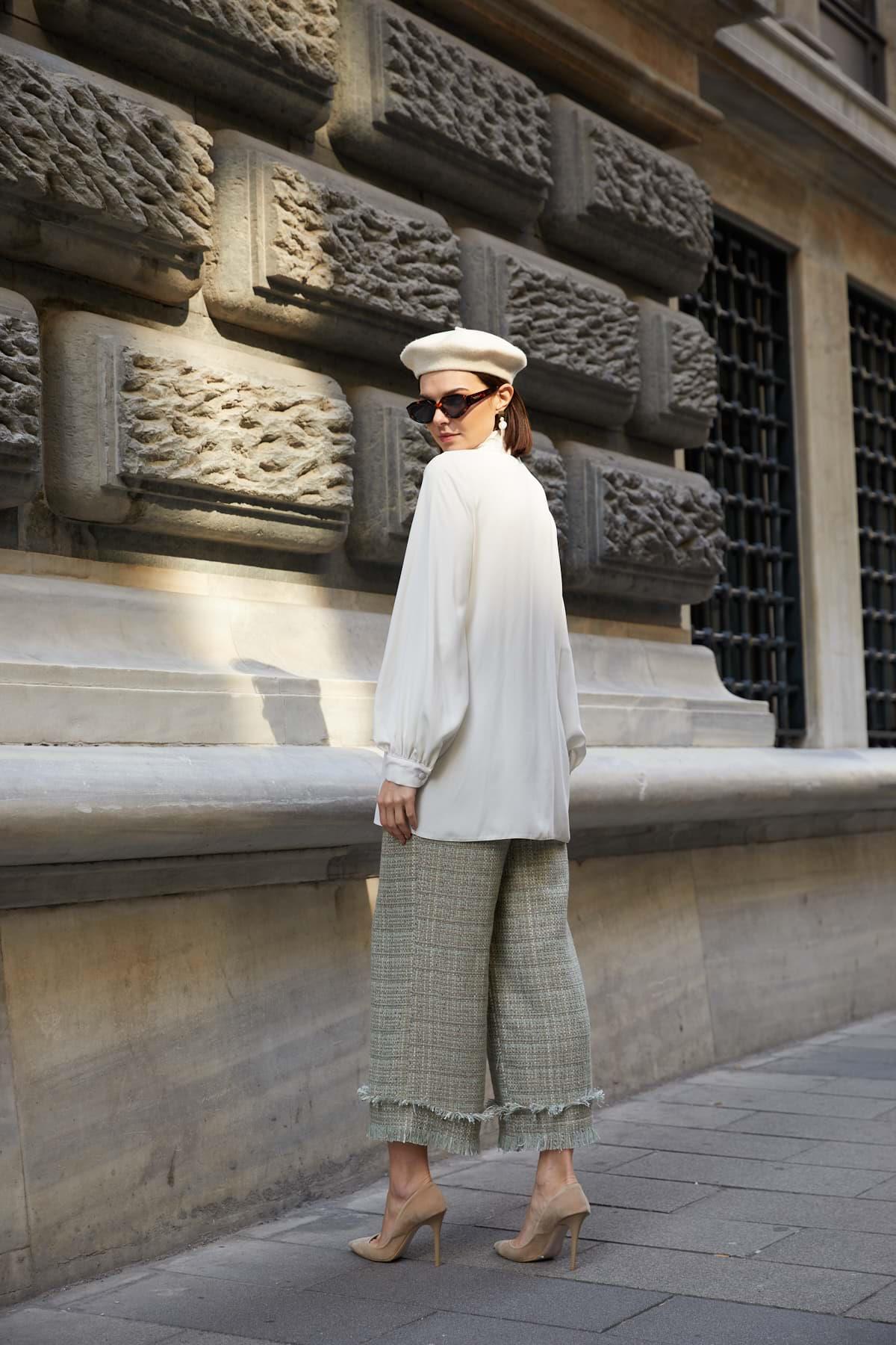 Balon kol gömlek krem Medine ipeği 1-2 beden olarak satışta Önden gizli düğmeli Kumaş Medine ipeği, boy 83cm. Pantolon üzerine de tunik olarak giyilebilir.