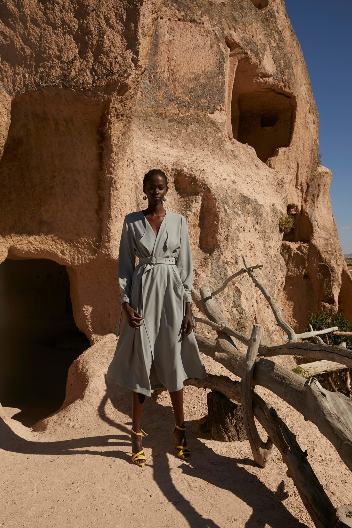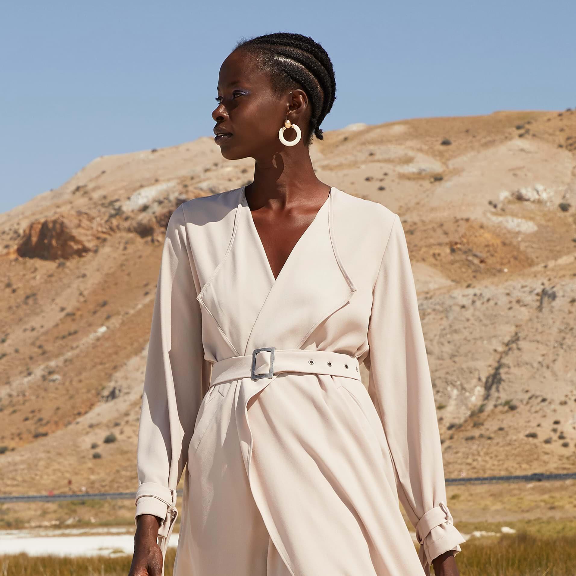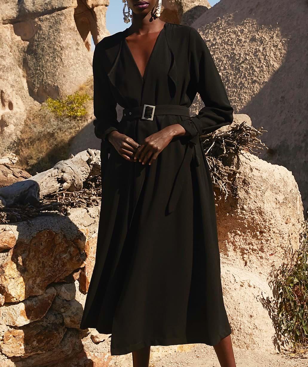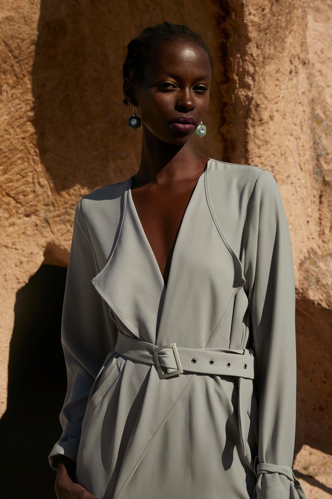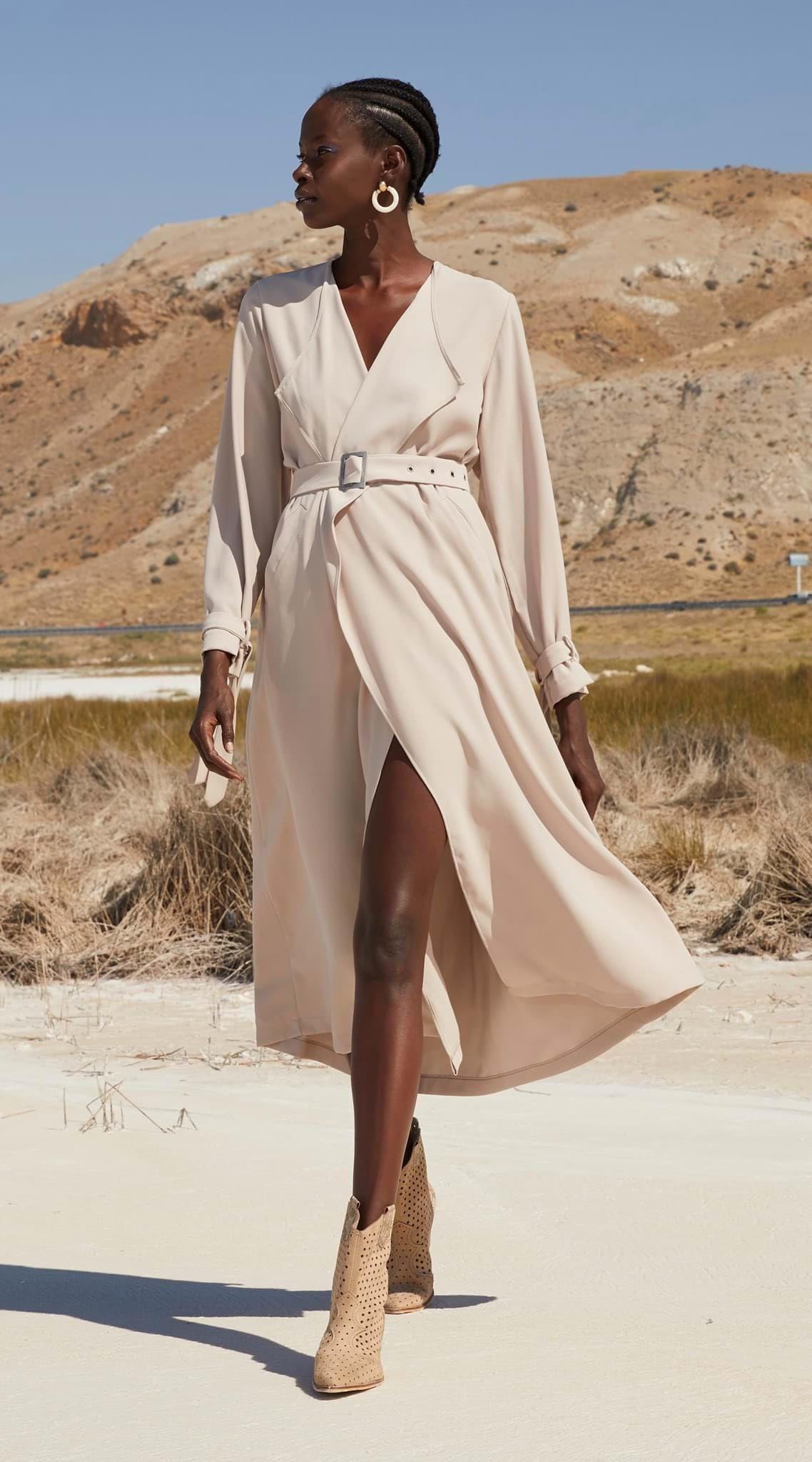1.Kalite krep kumaştır. Boy 128cm. Ayarlanabilen kemeri mevcuttur. Yanlardan cep detaylıdır. Bahar-Yaz mevsimleri dahil 3 mevsim kullanımına uygundur.