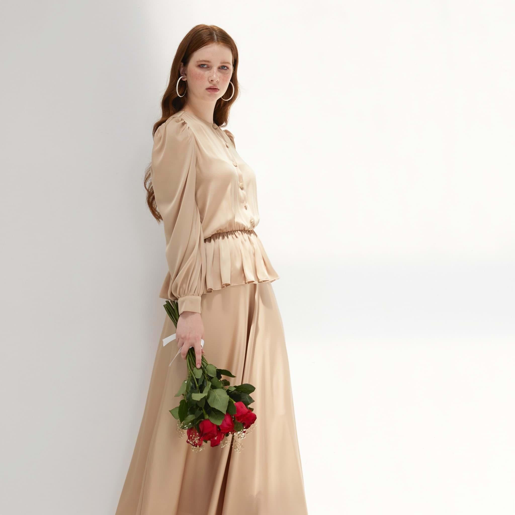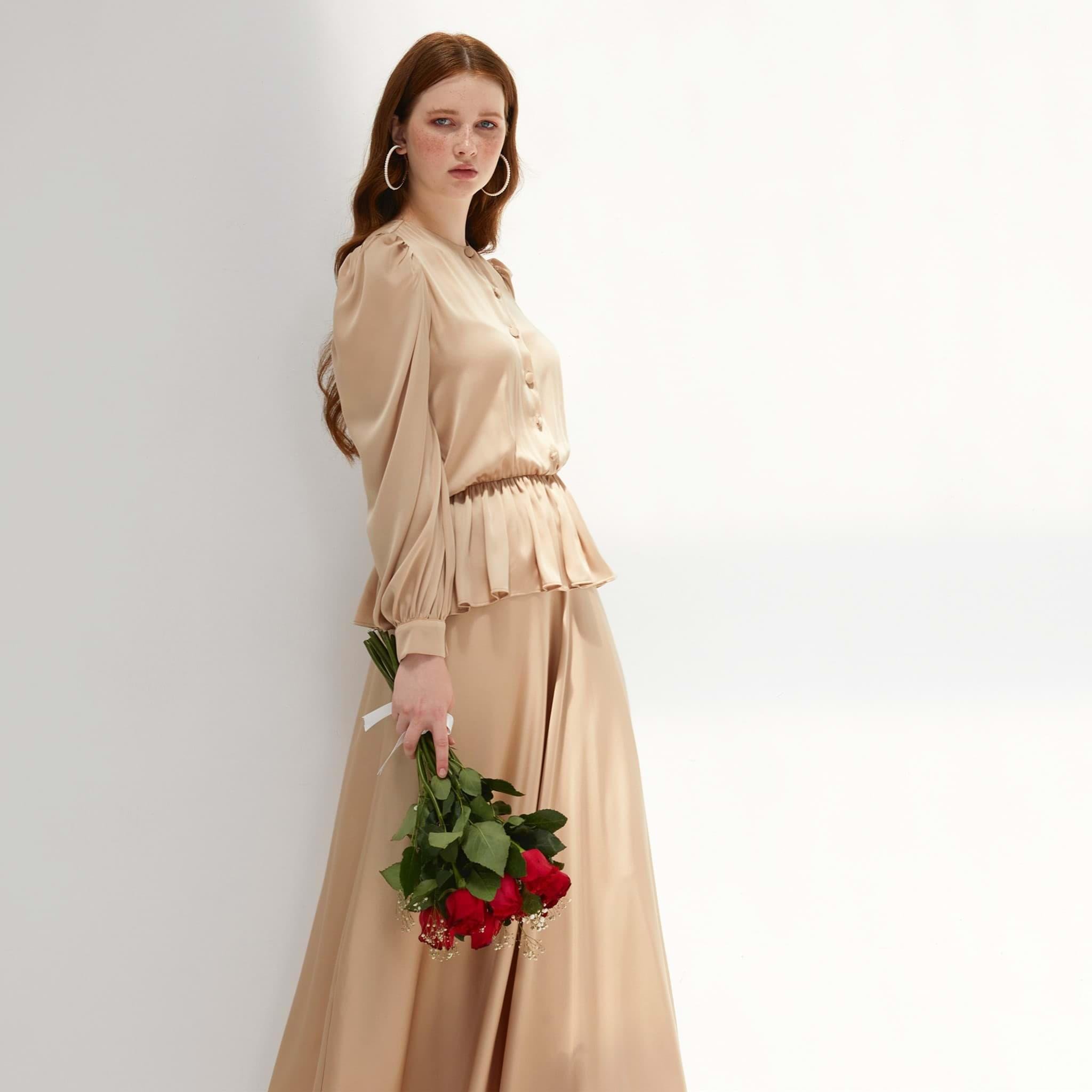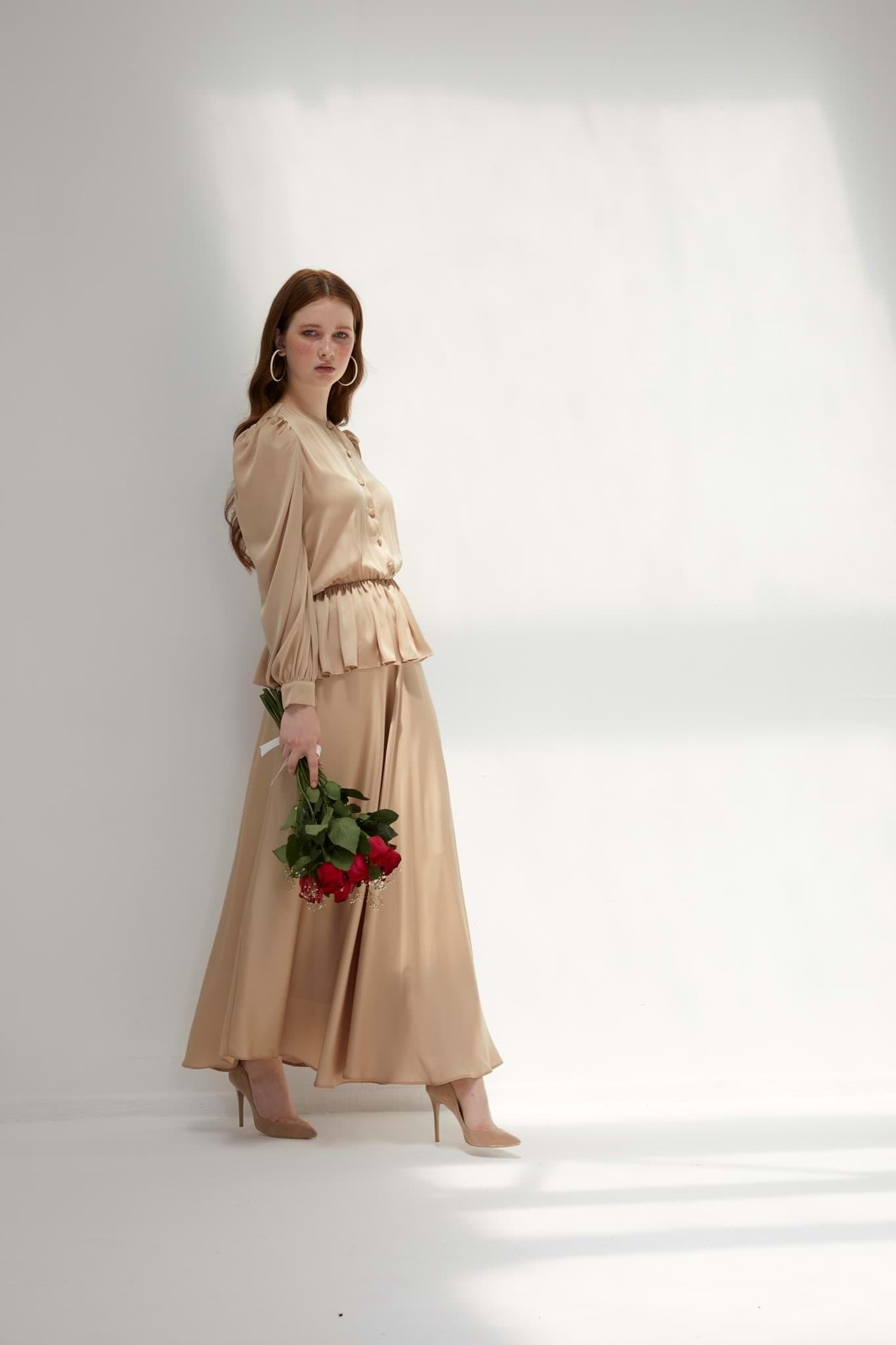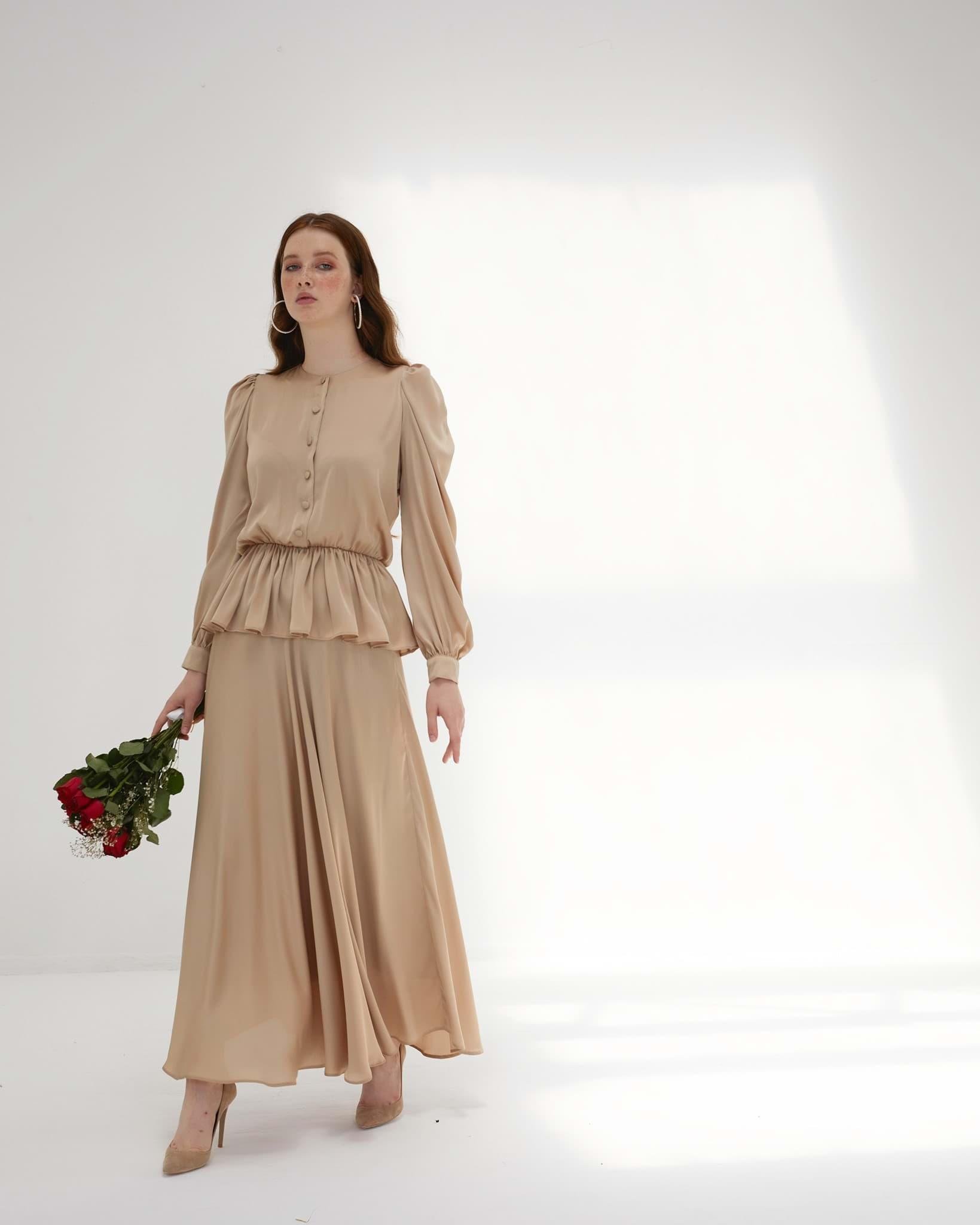 Vizon ipek saten gömlek etek takım Etek boy 95 cm beli arkadan lastikli yandan fermuar detaylı, astarlıdır. Gömlek önü düğmeli beli lastikli 1-2 beden olarak satışta 1 beden: 36-38 2 beden: 40-42 bedene