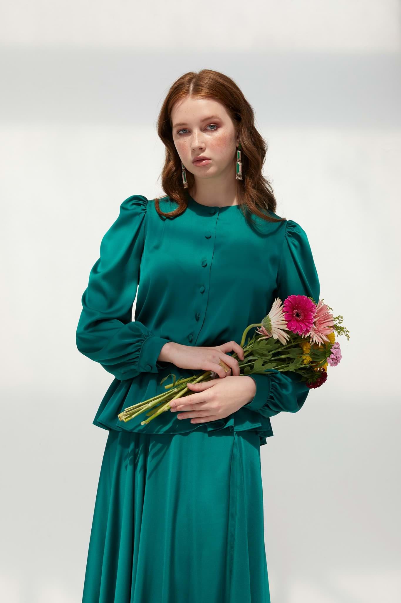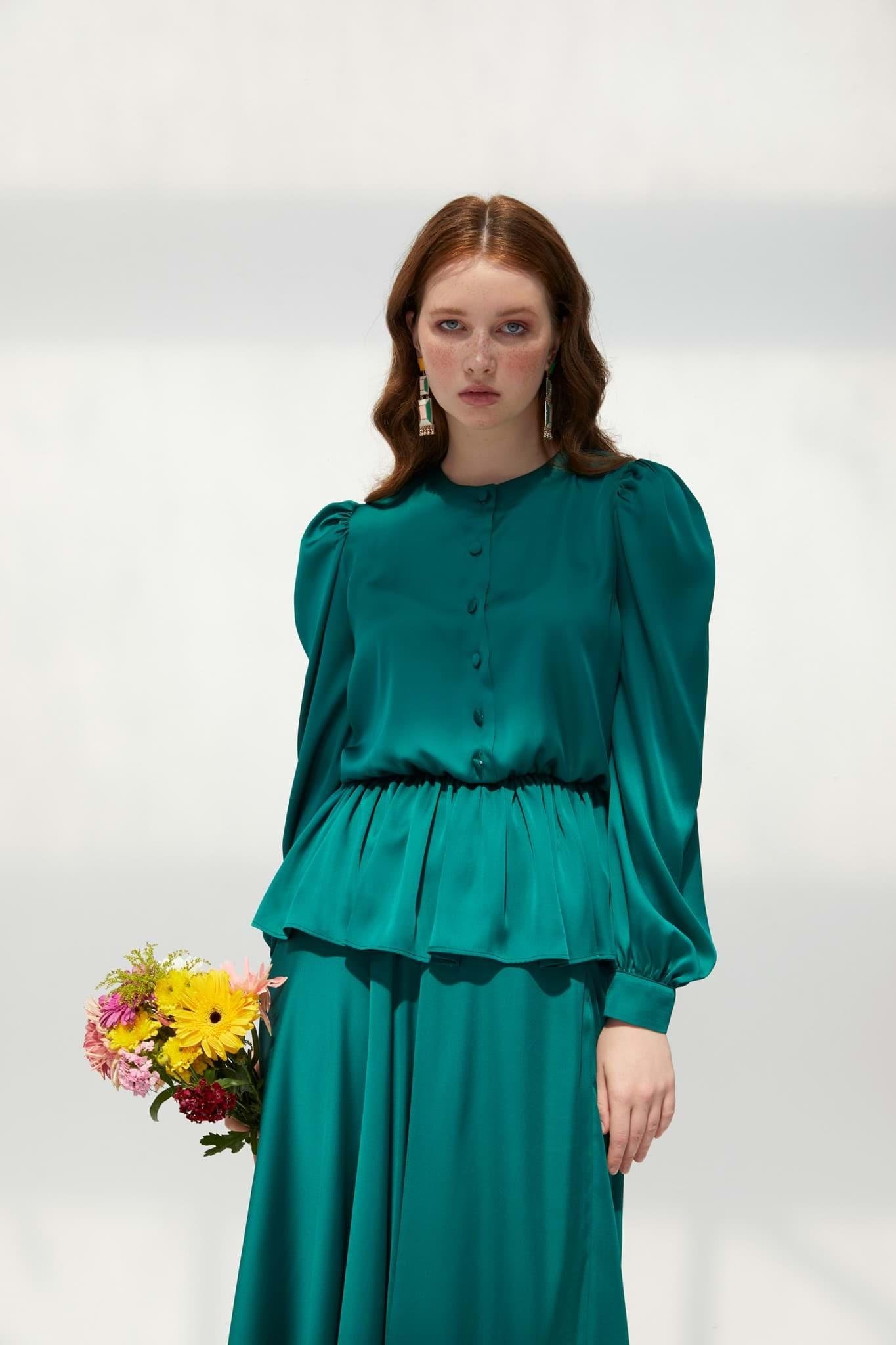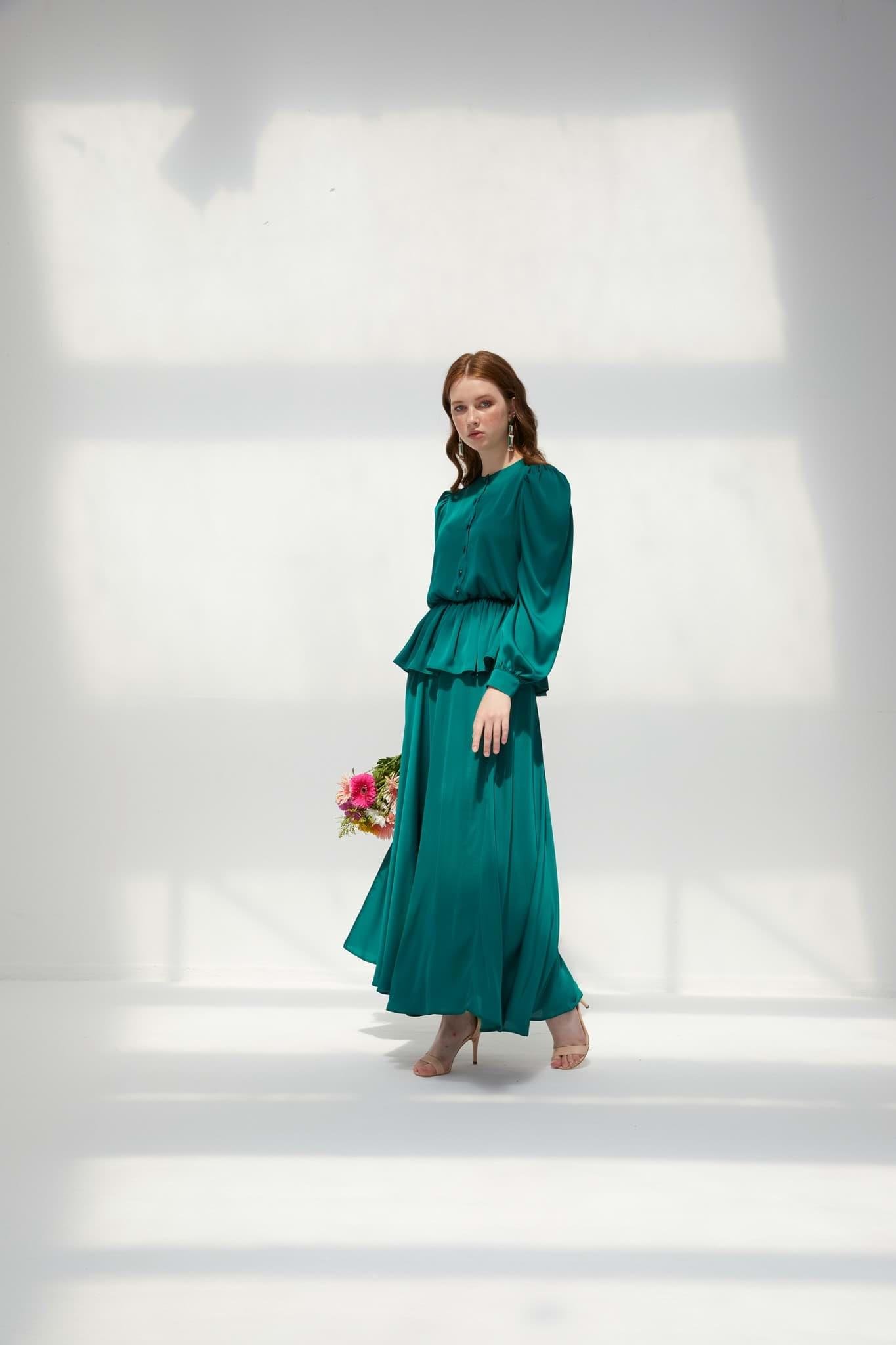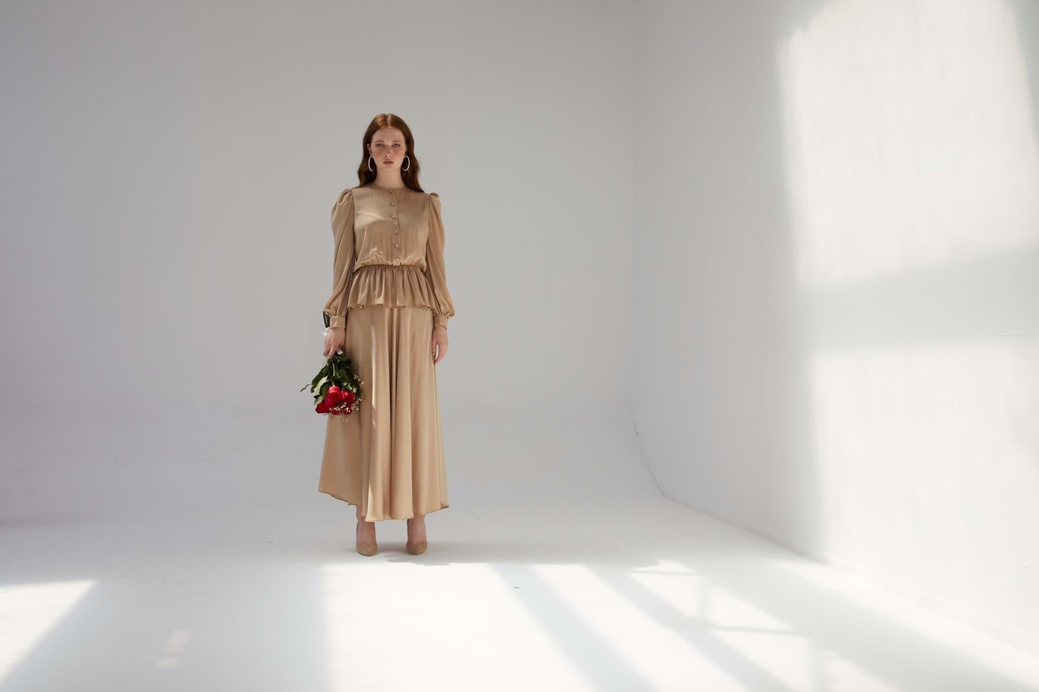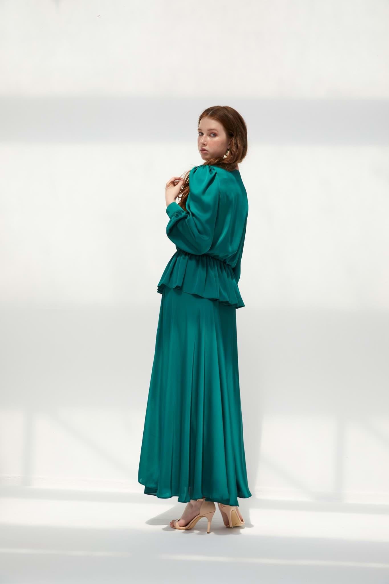 Vizon ipek saten gömlek etek takım Etek boy 95 cm beli arkadan lastikli yandan fermuar detaylı, astarlıdır. Gömlek önü düğmeli beli lastikli 1-2 beden olarak satışta 1 beden: 36-38 2 beden: 40-42 bedene
