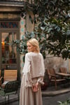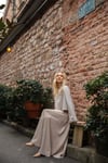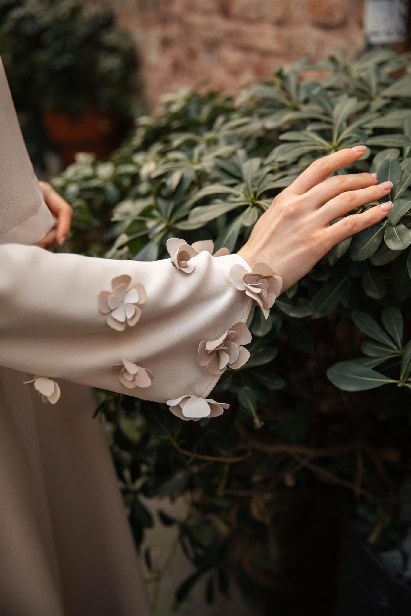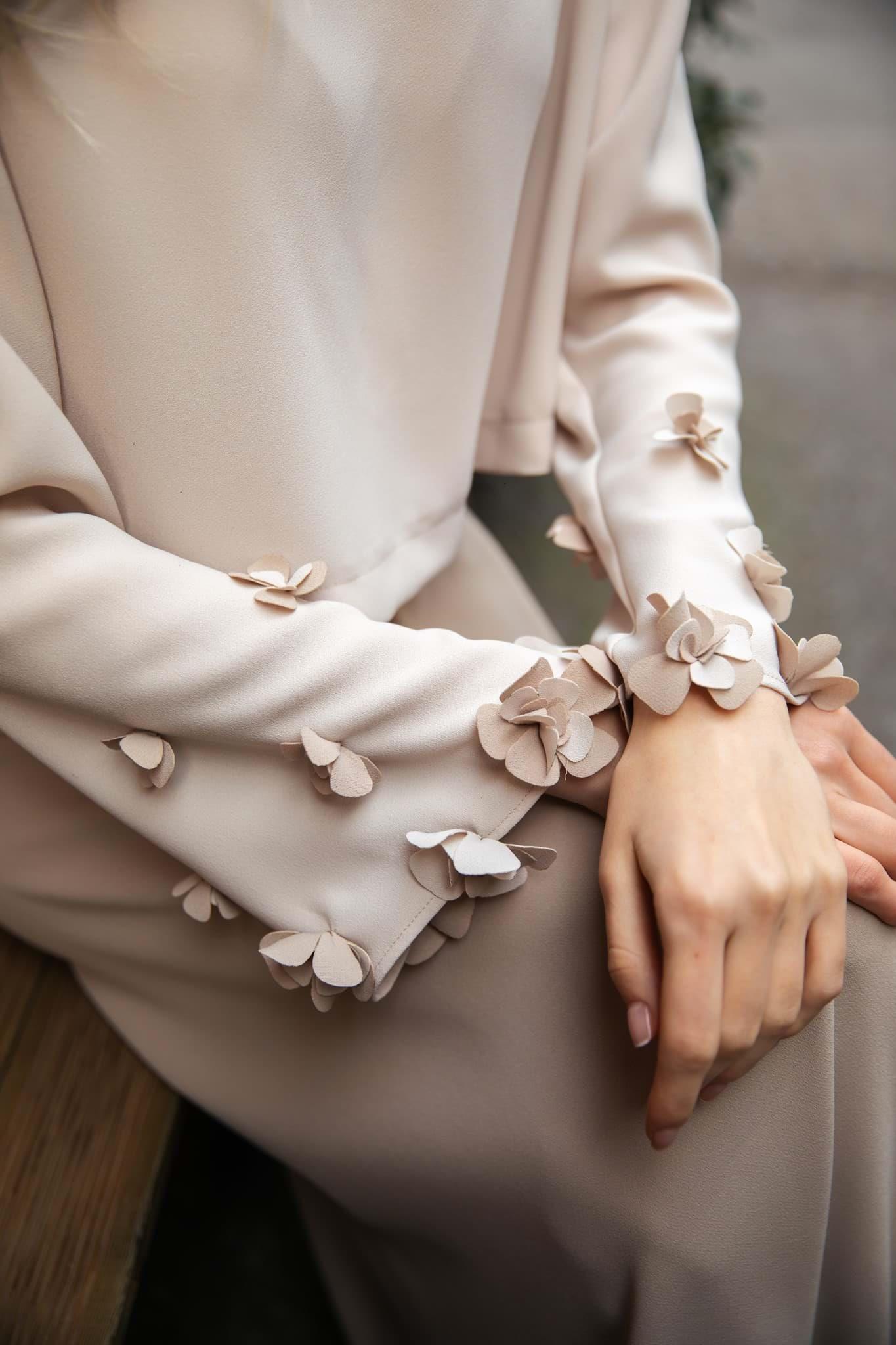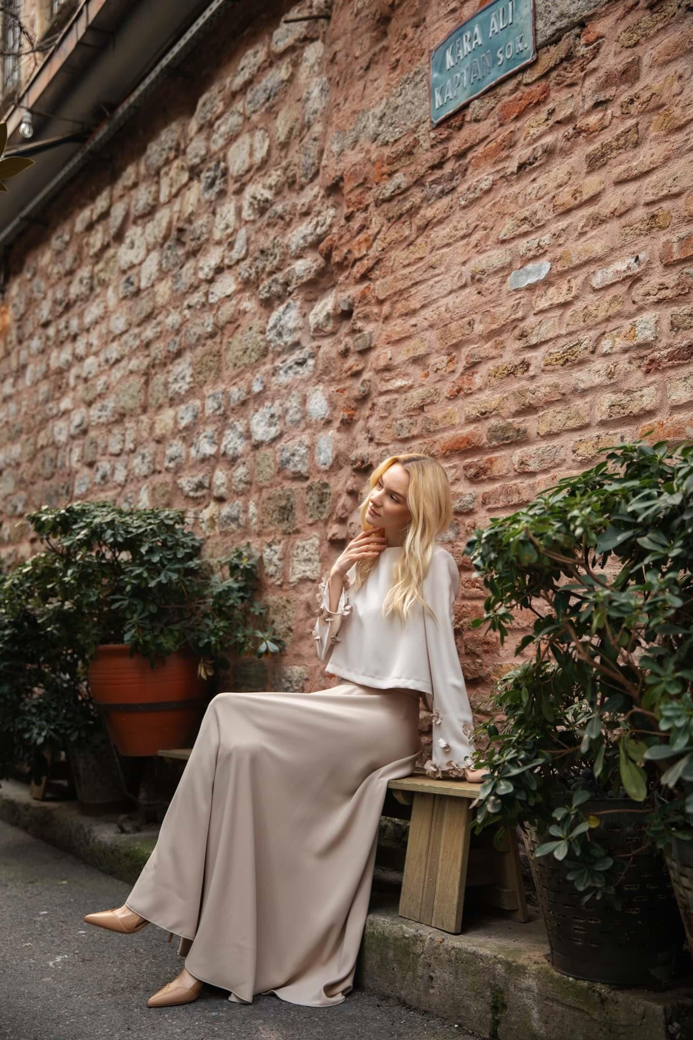Etek ve bluz den oluşan Lima takım tonsurton olarak sütlü kahve ve krem renklerin dedir etek boy 95 cm’dir yanlardan beli lastikli arka fermuar detaylı Double krep kumaş bluz el işçiliği kol çiçek detaylıdır
