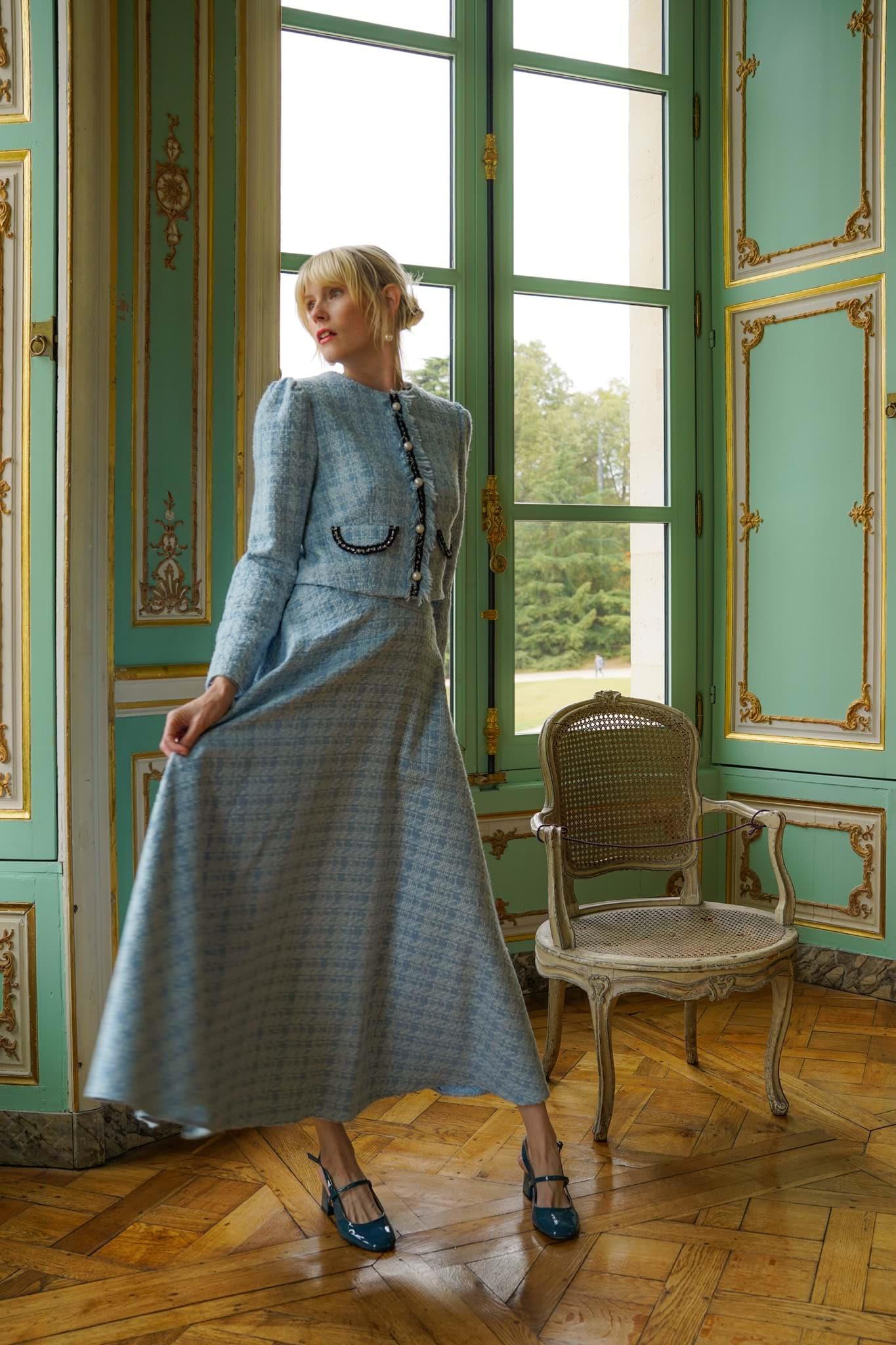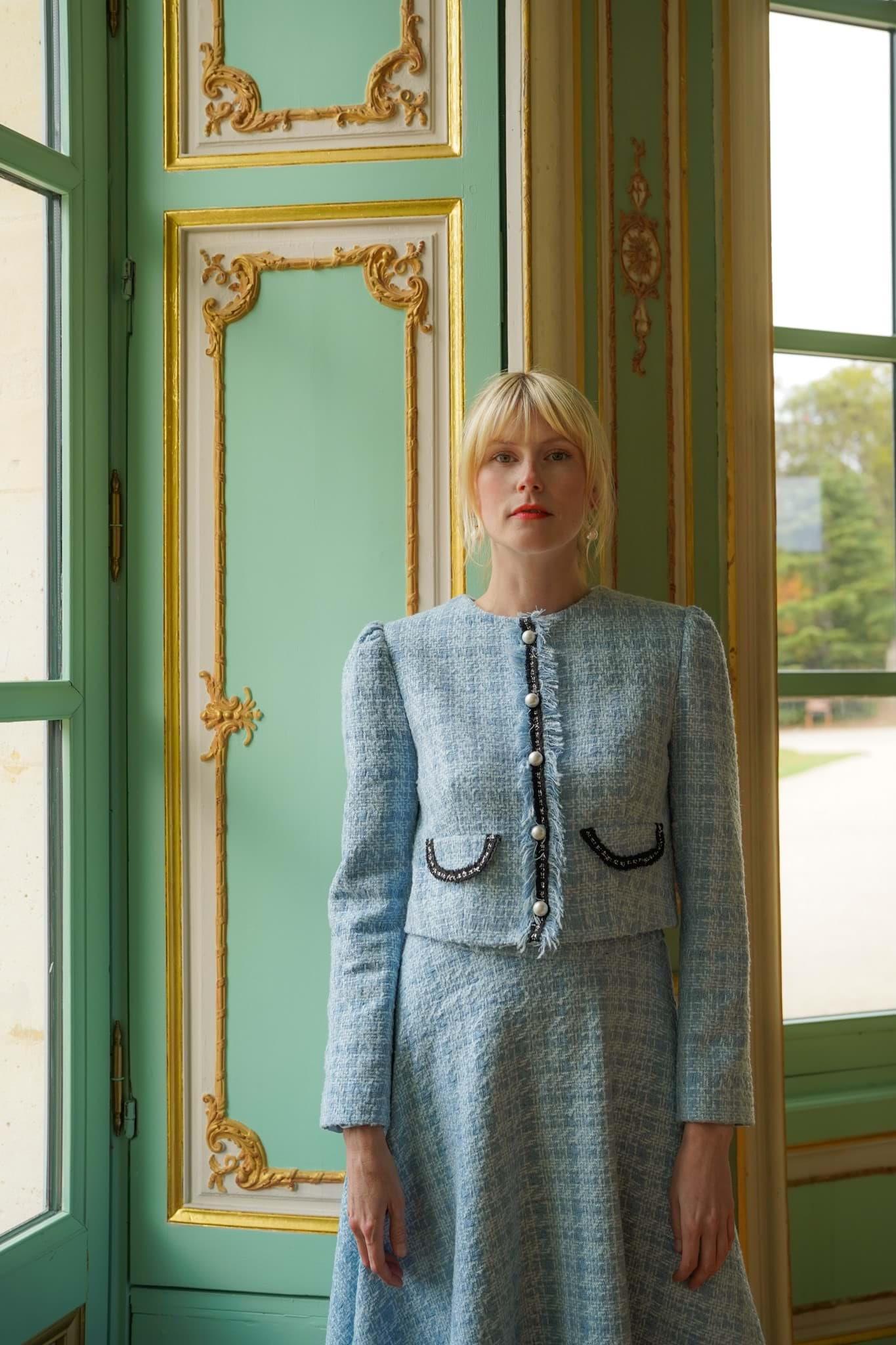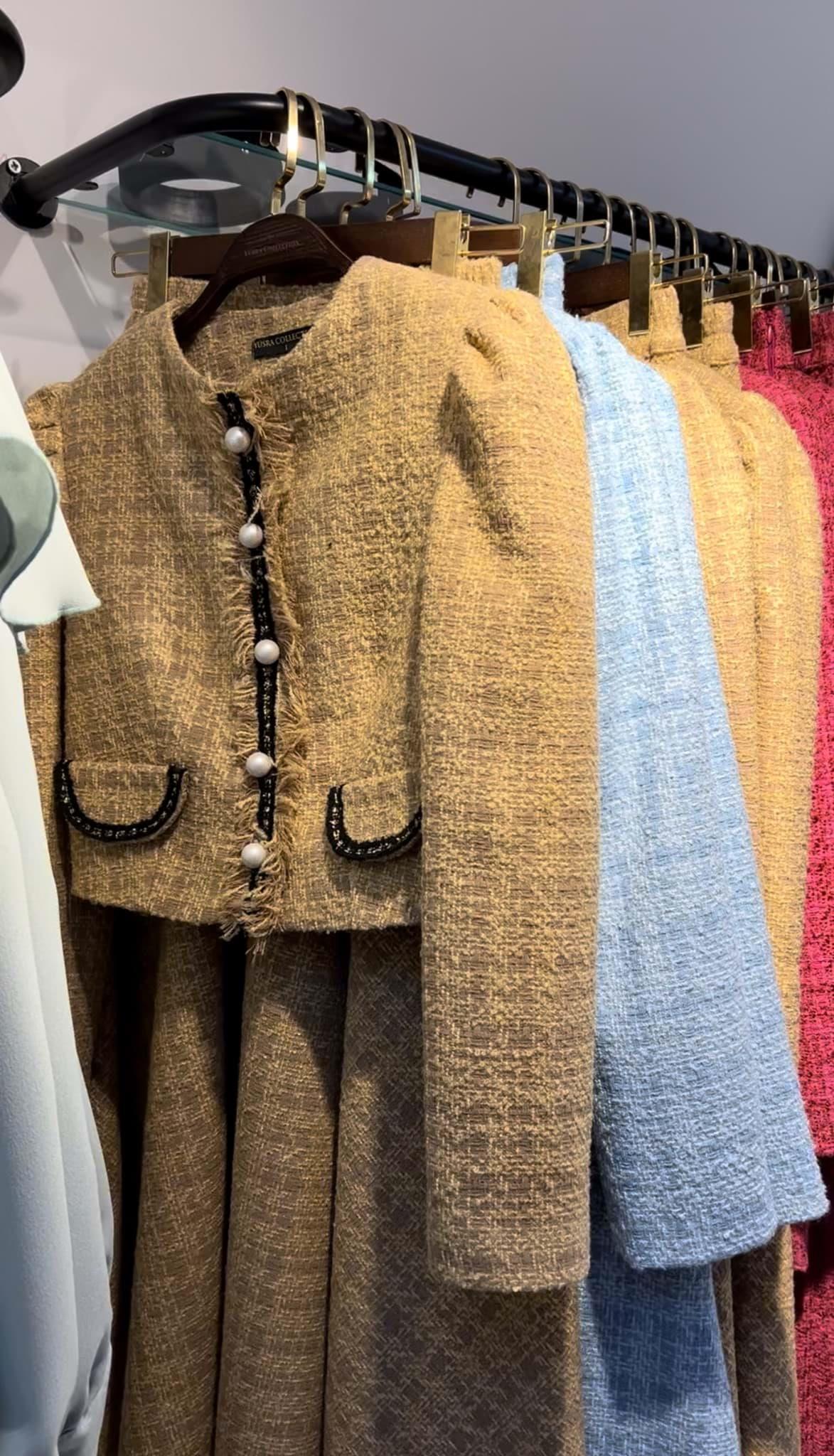 Sofia takım etek ve ceketten oluşan iki parçadır tüvit kumaştır yüksek kalite kumaş kumaştır ceket içten Tellalı ve ipek astarlıdır göğüs düğme aksesuarları inci detaylı Etek boy 93 cm yanlardan lastikli fermuarlı. Ceket boy 45 cm